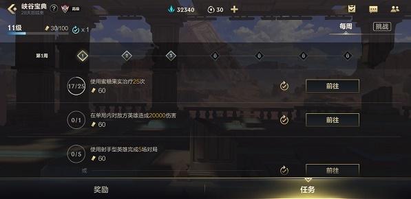 2.玩家想要使用任务卡首先需要进入游戏,来到主界面后点击左侧的峡谷宝典,进入宝典页面,然后点击任务。