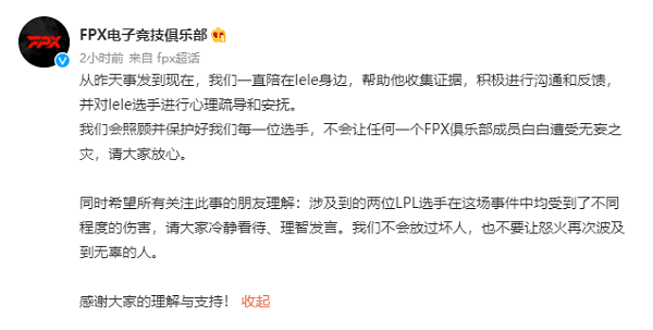 1.Uzi排位与队友互喷,而这位队友被标识为FPX二队辅助Lele,随后粉丝怒冲FPX辅助Lele的微博,之后被误会的Lele无奈发声,表明自己尊重LOL职业选手,该账号非自己所用,事发时间他正在参加FPX的训练赛。