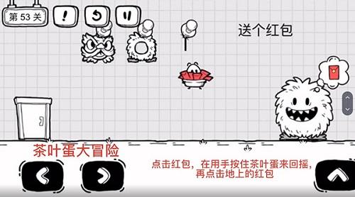 1、首先进入关卡,毛球怪过来要红包,点击界面上方的红包,茶叶蛋就会保住红包跳下来。