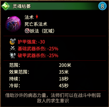 死亡系后期核心法术(主要原因是大招输出实在差),14蓝耗35m范围内减25%全部近战威力和30护甲,减少的都是非常重要的近战属性,唯一美中不足的是持续时间只能说还算好,和那些动不动持续50秒的一流debuff相比还是差了不少。