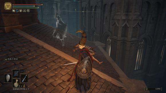 从桥上跳下去,我指着的方向距离正好可以跳过去,有消耗品和一个辉石面具。但我们要从右边走(有两个长矛怪的房顶)