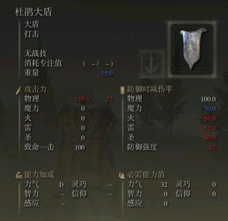 然后我们需要一个盾,最好是点到32力量拿杜鹃大盾,在这之前拿龟壳盾代替,另外金黄大盾也可以。