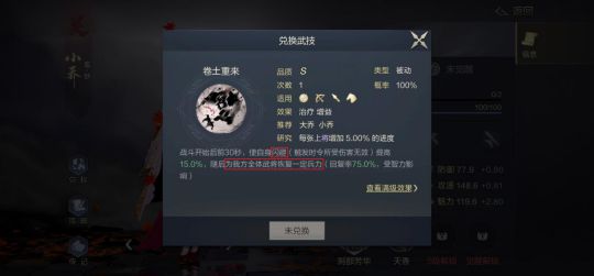 小乔可兑换的武技为S级被动武技“卷土重来”,同样是一个生存与辅助兼得的强力技能,开局30秒提高15%(满级30%)闪避,可以有效针对抢开局的队伍。30秒后,可以为我方全体武将恢复一定兵力,受智力影响。全体恢复兵力的支援效果更是雪中送炭,提高我方消耗能力。