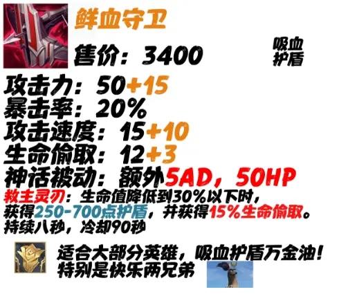 奇怪定位的甲穿装备,个人认为更适合优势换血英雄,为什么德莱文也会在这里,其实和血刃德莱文是一个道理,这个还有移速护盾加成,更加的强!对于剑魔瑞文也是如果,强化自身护盾以及回复能力在换血中取得更大的优势。