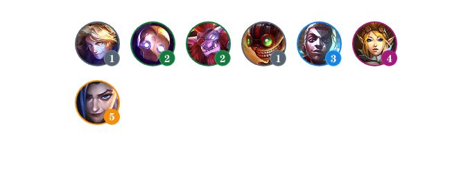 英雄:伊泽瑞尔(1),吉格斯(1),布里茨(2),特朗德尔(2),艾克(3),迦娜(4),金克丝(5)