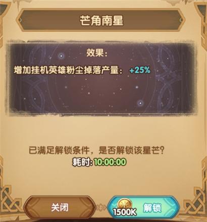 至于其他星座就要根据需求来解锁了,缺粉尘就解锁【号角座-芒角南星】,缺钻石就解锁【圣杯座-北沿星】,缺高级装备就解锁【神盔座-铁芒星】。解锁之后,都可大幅提升这些资源的日常产出。