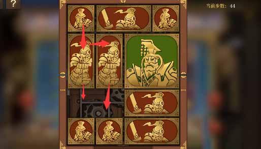 10、下半部分的方块继续顺时针旋转,最后让左下角的小方块全部贴边让将军向左移动一格即可完成本关。