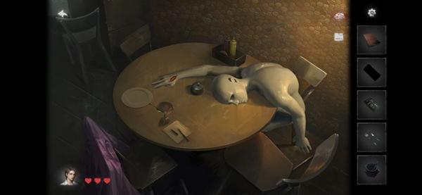 5、吧台上有菜单,在其他餐桌上能够获得刀叉,让小男孩和吧台男三个人点好菜,假人喝完趴下,手上出现嘴唇印。