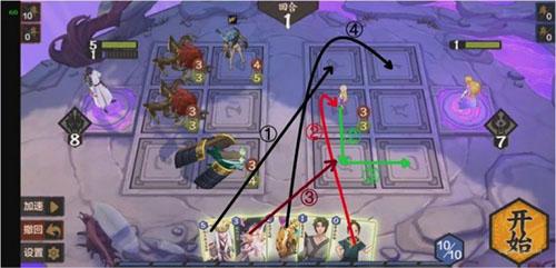 本关要利用食人树(怎么又又又是食人树),上方的山君娘娘直接用泰恒解决掉就行,然后在上路和中路安排好攻击力小于3的生物以保护食人树,在丙位让椒图回手牌(不然丙位会被无名侠士占住),遗孤在己位进行最后一击,解法如下: