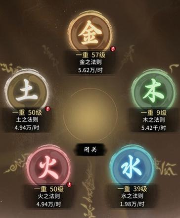 闭关就是使用道果直接得到不同小时数可领悟的道法点,当前领悟速度由各项法则的领悟速度共同决定,得到的道法点五行法则共用。