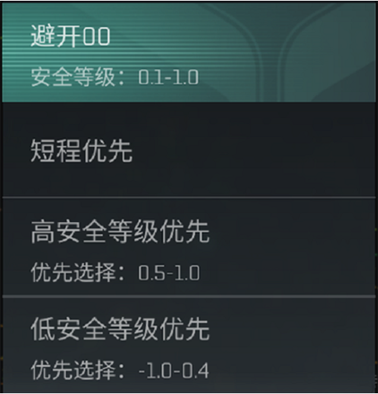 共有“避开00”,“短程优先”,“高安全等级优先”,“低安全度优先”四种路径参考。