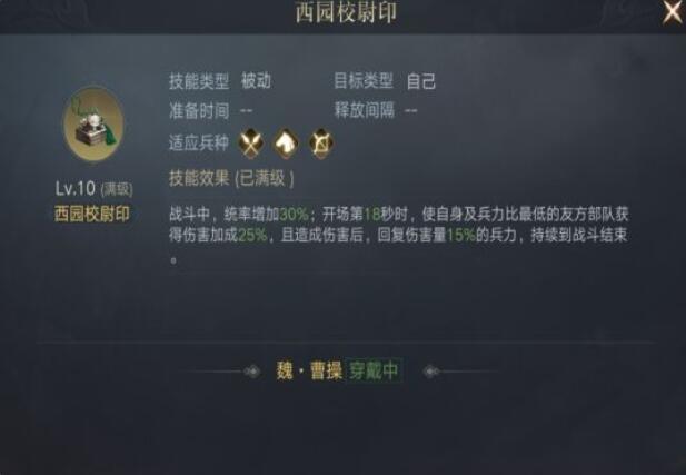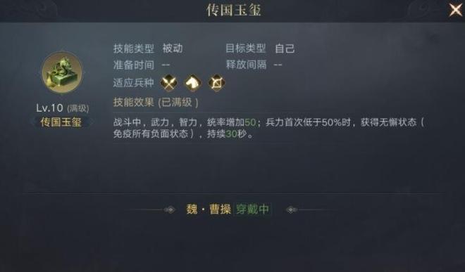 战斗中,每隔7.5秒,自身获得以下效果中的两种:兵力吸纳+12%,持续7.5秒;武力、统率、智力+15%,持续7.5秒;伤害减免+12%,持续7.5秒。
