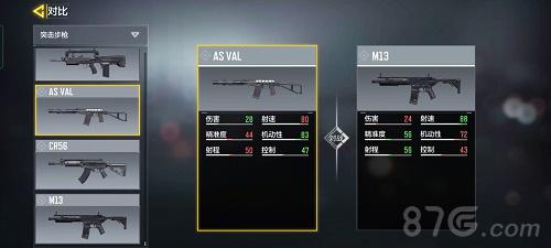 如图所示,在和AS VAL(巨浪)的对比中可以看出,M13在射速上、精准度、射程都比巨浪更胜一筹,尽管伤害差了4点属性,但是只要射速快,精准度高,这点伤害值还是可以忽略不计的。