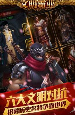 文明霸业之中使用了真实的历史世界观,刻画了一个不同历史的平行世界,玩家可以在这里获得国内的历史名将,或者获取各个时期的伟人,角色根据他所在时期的历史与事迹来设计技能,比如宫本武藏作为忍者宗师便拥有独特的忍术buff,令他总可以先发制人。同样的,这款游戏的角色获取也是通过抽卡,但游戏角色丰富,爆率极高,buff内容繁多,不存在绝对劣势的队伍,只有不完全的队伍。