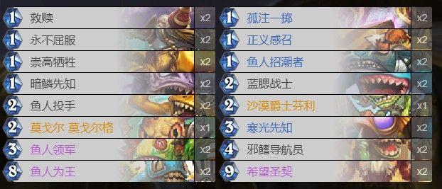 核心思路:最快1费叫杀,利用低费奥秘和法术快速刷出鱼人为王。希望圣契则是鬼抽下的保障。