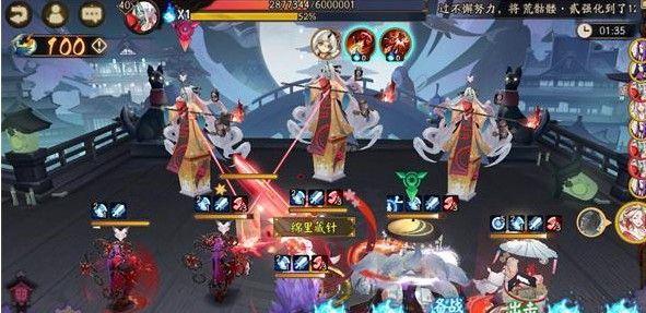 最后一天的炽火姥姥有点像鬼灵歌伎的形式,一个大boss带两个小怪。简单模式略过不提~困难关的主怪携带针女御魂,攻击是多段随机伤害;左边小怪携带鸣屋,是高输出群攻;右边小怪携带日女,在释放小额群体伤害同时,附带随机晕眩效果。