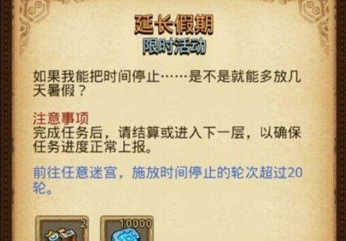 不思议迷宫延长假期定向越野是新上线的挑战任务,完成这个任务玩家就能得到奖励了,任务的要求是施放时间停止的轮次超过20轮,这个并不是所有玩家都能轻松过关的,需要借助攻略了解本次定向越野任务的详情才能选择合适的阵容进行挑战。