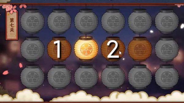 进入关卡后先点击左上角的花灯,然后点击第三排第二个花灯,再在右边依次点击四个角落的位置,最后点亮所有花灯即可成功通关。