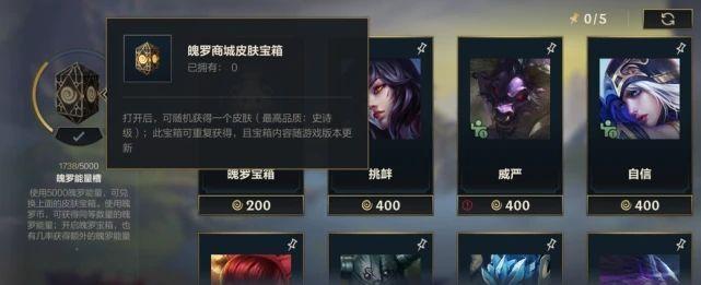 2.魄罗商城中的魄罗能量槽,也就是那个积攒满5000能量兑换一个皮肤箱子的进度条中的魄罗能量是和魄罗能量商店使用的魄罗能量共享的,比如现在能够用魄罗能量购买的几款皮肤,玩家购买之后,魄罗能量槽中的能量就会消失对应的数量。