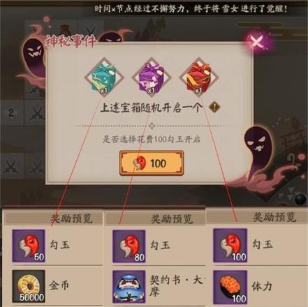 5.小鬼交易看上图,花费100勾玉抽福袋。抽到红色福袋是非常赚的呢,冲冲冲!