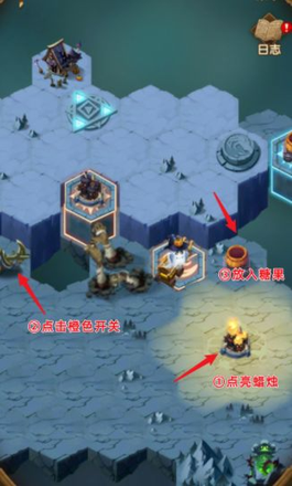之后,点击蓝色机关,然后点燃蜡烛,最后,再点击橙色开关升起蜡烛。