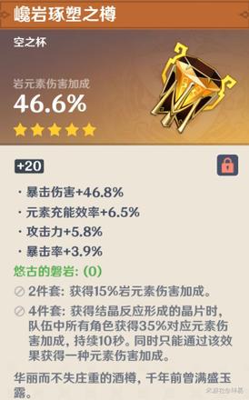 属性:2件套15%岩元素伤害加成,4件套获得结晶反应形成的晶片时,队伍中所有角色获得35%对应元素伤害加成,持续10秒。