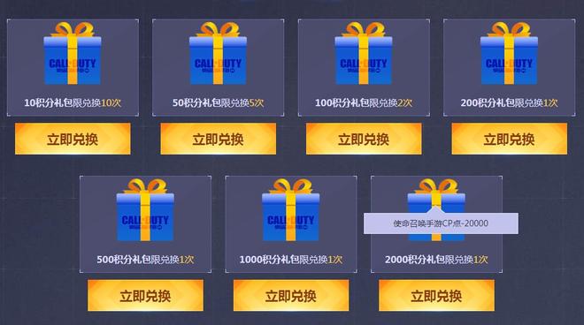 5.活动第三部分,系统将根据您登录活动QQ号对应四个大区角色在《使命召唤Online》中剩余的CP数量,按照1000:10的比例转换成积分,大于0不足1000的部分向上取整。例如,您的剩余CP数量为2222,那么向上取整为3000,您可领取30积分。消耗对应数量的积分,您可以选择兑换相应的礼包,兑换次数不能超过指定的上限,请合理安排积分消耗。