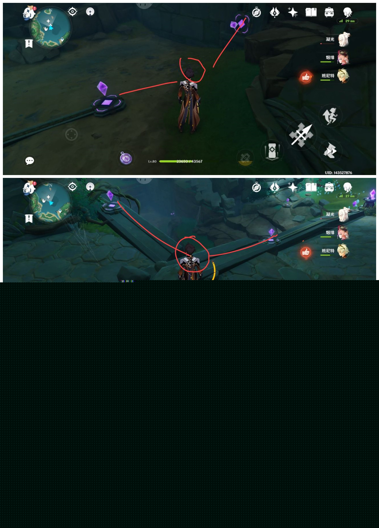 3.在这其中有两个仙灵是很显眼的,一眼就能看到,而第三个则是藏在了一个大石块后面,位置如图: