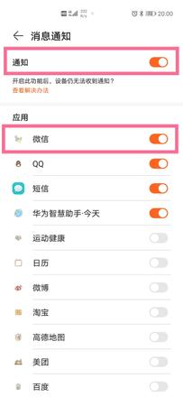3、打开【通知】开关,同时在下方应用列表中打开微信开关。