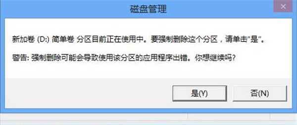 4、如当前分区还有正在使用的文件或运行中的程序,将会有如下图提示,再次确认是否已经备份,如果没有备份,点击“否”;如果已经备份,点击“是”可进行强制删除。