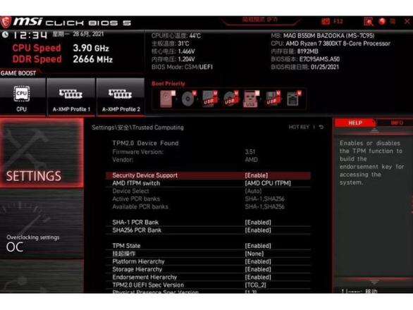 2、AMD fTPM switch,改成AMD CPU fTPM,上面的Security Device Support改成Enable即可。按F10保存重启。