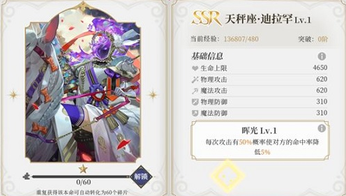 6、SSR迪拉罕:每次攻击有50%概率使对方命中率降低5%。这个也属于多段技能角色更吃香的本命,但往往是为了针对PVE中的难度关卡才拿出来配备。一是PVE中怪物的伤害往往较高,规避了很赚,二是因为PVE玩法可以重复战斗探索更高难度,PVP只能博一次运气。