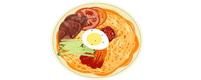 冷面是用牛肉汤或者鸡汤,再搭配辣白菜、肉片、鸡蛋、黄瓜丝、梨条等食材制成的。食用的时候,先在碗中放入适量的凉汤和面条,再放入一些佐料,最后再浇上准备好的汤汁,酸辣又适口,十分的美味。