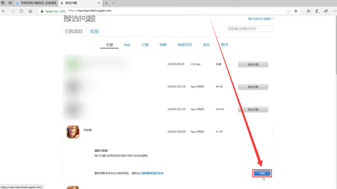 4、找到你要申请退款的充值订单,点击右侧的【报告问题】。