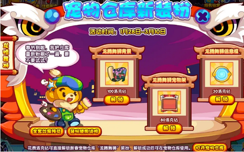 4、分别是龙腾舞狮北京、龙腾舞狮宠物架、龙腾舞狮信息框,分别需要100洛克钻、80洛克钻、30洛克钻,解锁成功以后可以在宠物仓库里面使用。
