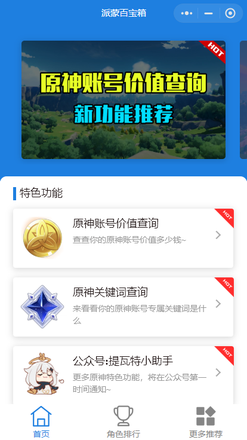 2、这时候就会进入到派蒙百宝箱小程序了,里面特色功能之一就是原神账号价值查询。