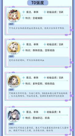 4、以上就是换形阵营的强度榜了,从强度榜上可以看出来,阿德琳、娜尔科缇丝、修狄斯这几个角色抽到后都是可以培养的,其他的SR卡和R中也有非常不错的角色,土豪就培养SSR,平民玩家可以培养1-2个然后培养其他的SR或者R卡。