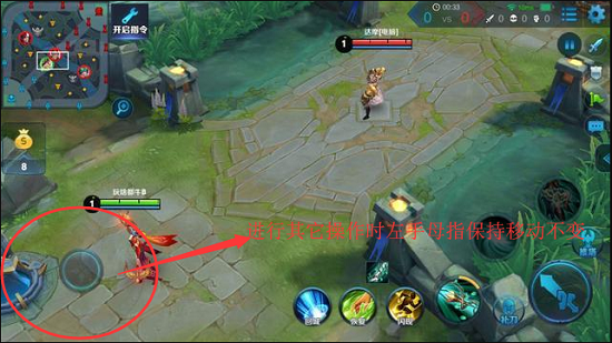 2、在对战的时候,通过左手拇指不断移动进行走位,右手拇指释放技能。最关键的一点就是左手食指的运用,左手食指可以在左上角的小地图上不断移动来放大查看当前“眼盲区域的视角”,这样既能了解当前区域的作战情况,还能了解敌方残血英雄,随时进行击杀。