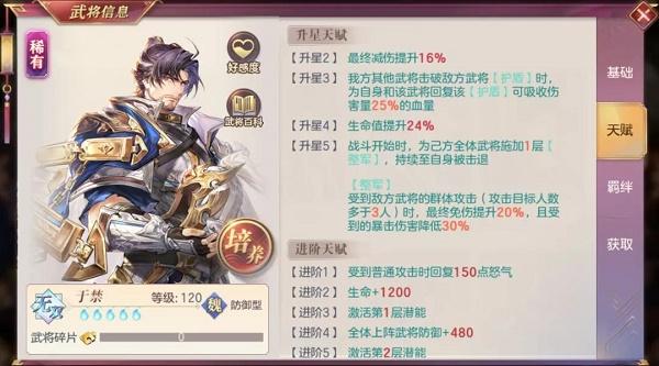 和乐进相反,于禁提供的大部分都是防御类属性。同样属性也很全面,减免、回血、回怒以及异抗。