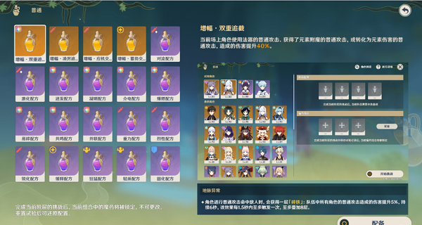 1.普攻流主c:可以用搭配增幅·双重追截、共鸣配方、锐化配方(区别重击和下落攻击)。目前纯普攻流,法器或者还被元素附魔的角色不多,基本都是打重击偏多。