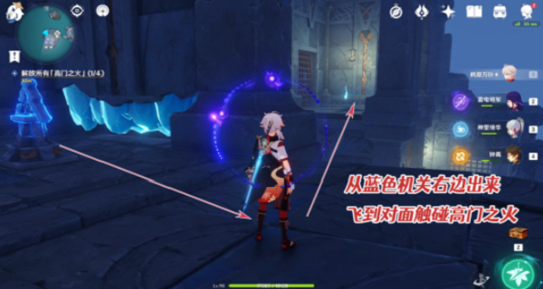 2.第2处高门之火:飞过去之后攻击一下这个蓝色的三角机关(注意这里也要常夜状态)。我们来的方向的二层隔间的石墙就会靠到蓝色三角机关这一侧,我们就可以飞回对面二层拿到第2