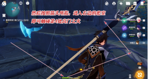 4.第4处高门之火:触碰完第3处高门之火后,我们转头往西边直走右转,就会看到一层的一个黄色的三角机关。打一下这个机关,旁边的栅栏就开了,但是里面的另一个机关是残缺的,不要紧,这里我们再回到二层的日月轮回机关,将其调整为「常夜」。
