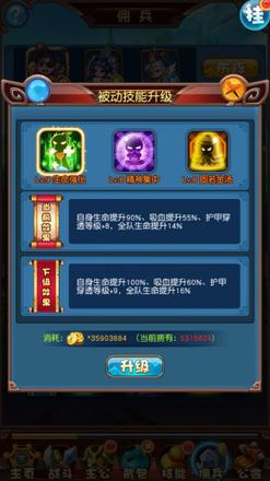被动技能,每个佣兵都有3个被动技能,后两个技能所有的佣兵都是一样的。而且,佣兵的被动技能升级后是可以影响全队的,比如全队伤害提升或者减免。所以一定不要忽略佣兵的被动技能,它是可以影响到主公和别的佣兵的,能加就尽量加满级。值得一提的是,佣兵的被动技能的升级是和金币挂钩的——它们是通过金币来升级的。所以大家一定要注意金币的获得和存储。
