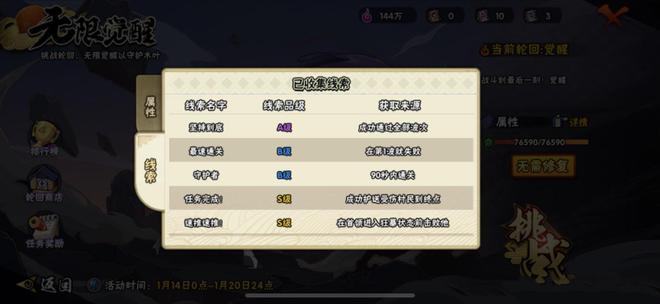 3、无限觉醒是宇智波鼬记忆中的特殊修行。玩家在修行中可获得查克拉,达成特殊事件可收集S线索,A线索,B线索,消耗线索和查克拉可在轮回商店兑换超强能力,积累超强能力进一步挑战更高难度的修行,达到指定条件,即可领取每日宝箱奖励和成就奖励。