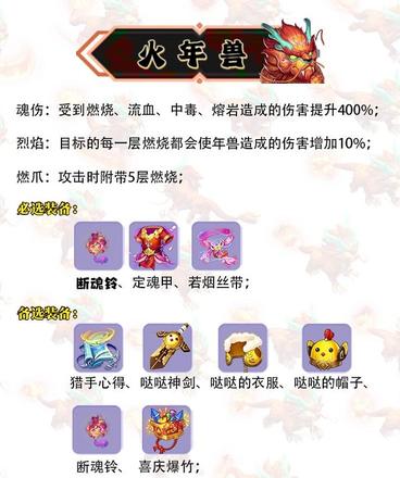 去年的年兽可以快速打出最高伤害的排行大致为:火年兽>冰年兽>血年兽>雷年兽>风年兽>土年兽。