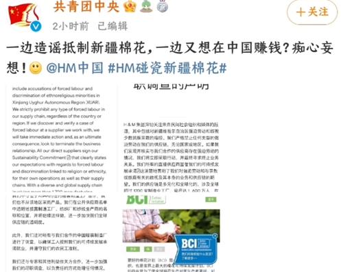 首先在不久之前,共青团中央发布了一篇声明,说HM恶意造谣抵制中国棉花,说新疆的棉花是我国强迫新疆人民生产的,还说我国歧视少数民族和宗教,这是非常明显和恶劣的辱华行为。