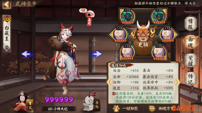 小白用来吸收伤害,防止双拉阵容一套秒杀重要的C位式神,推荐速度+116以上(本身被动自带的40速度,不需要太高的要求),抵抗随缘