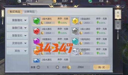 在“交易系统”中一共有“商会”和“寄卖”两种交易方式,首先来为大家介绍“商会”的玩法。商会的交易种类有装备强化,装备打造,宝石,灵兽培养和其他。玩家需要注意的是“商会”里的商品价格,是会根据物品的是否销售火热而改变价格的。(3/4/3/4/7/手/游/网/搜/索/更/多/攻/略,34347.com)