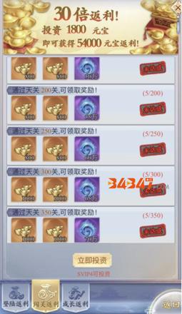 在百倍返利的闯关返利中,会有一定的指定关卡数,只要能够通关到这些关卡,便可以获得很多真气,同样,通关数越多,获得的真气就越多。