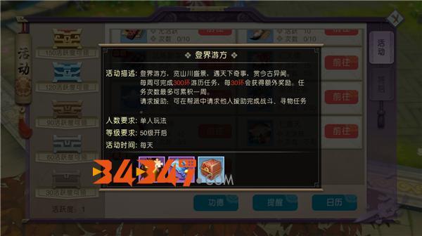 首先,解锁登界游方需要加入帮派,再加入帮派后,当等级达到50级后,即可解锁登界游方。活动每天任意时间都可参与,但只能单人参与。